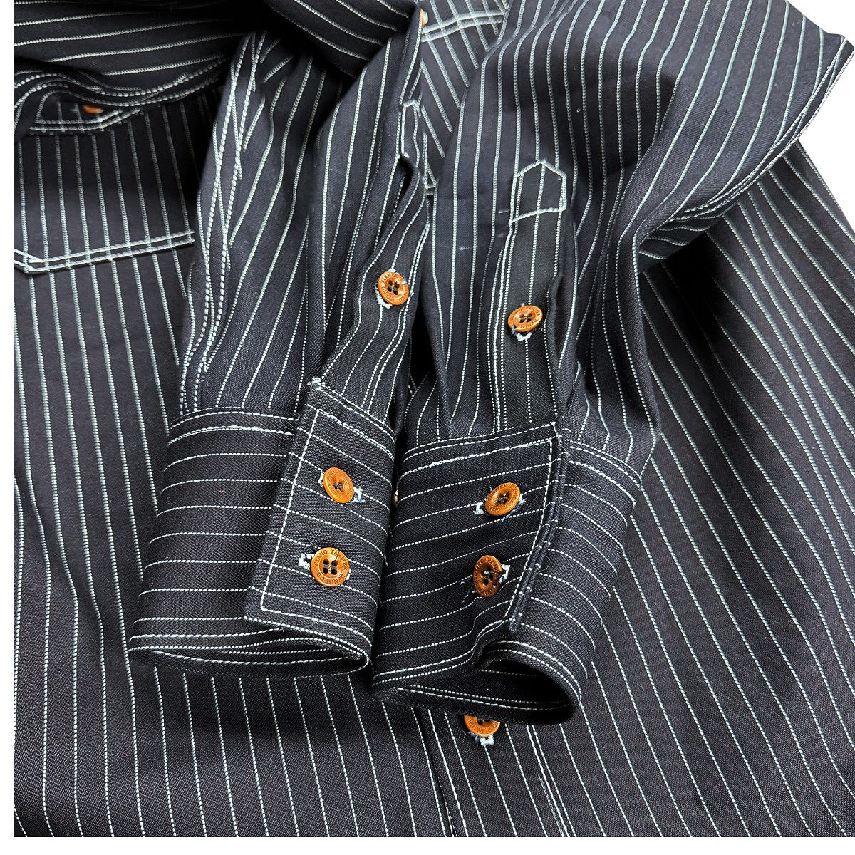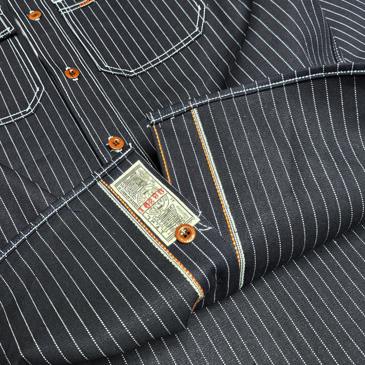 Wabash looks like quite a formal fabric, but in fact it was commonly used for work wear from the early 1800s through to the early 1900s, very often as uniforms for the massive US railroads work force. Finding out a lot about Wabash is very difficult, but we believe there were 2 ways in which the dots were originally “applied” to the base fabric: 1) the pattern would be applied as a block print to the un-dyed fabric with a starch based “resist” and then dyed, the dye not adhering to the resistant pattern; and 2) the fabric was dyed and then the pattern bleached into the fabric - this was done by applying a mildly acidic solution to the cloth via copper rollers with the pattern raised from the surface of the roller, a process known as discharge printing. Perhaps the most famous of the American Wabash dying and printing companies was J.L. Stifel & sons set up in West Virginia in 1835. T hey called their product "Indigo Wabash Stripe" and it was often characterized by an impressive assortment of dots, triangles and diamonds. A few examples of these can be found in "King of Vintage vol 3" by Rin Tanaka. Our latest Wabash fabric, is created utilizing the jacquard weave technique. This fabric is not discharge printed as an original Wabash would be. Because we use a jacquard technique for the ticker stripe, the stripe created will not fade and will age with great character.