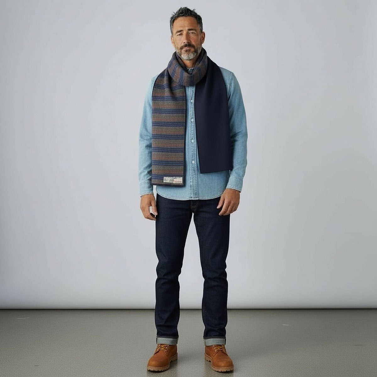 Crafted from premium Navy Japanese bull denim bonded to soft cotton flannel, this substantial scarf delivers warmth and durability through its thoughtful construction. At 96 inches long and 13 inches wide, it provides generous coverage for cold-weather layering. Made in Texas, this piece combines heritage textile quality with practical dimensions for everyday wear.